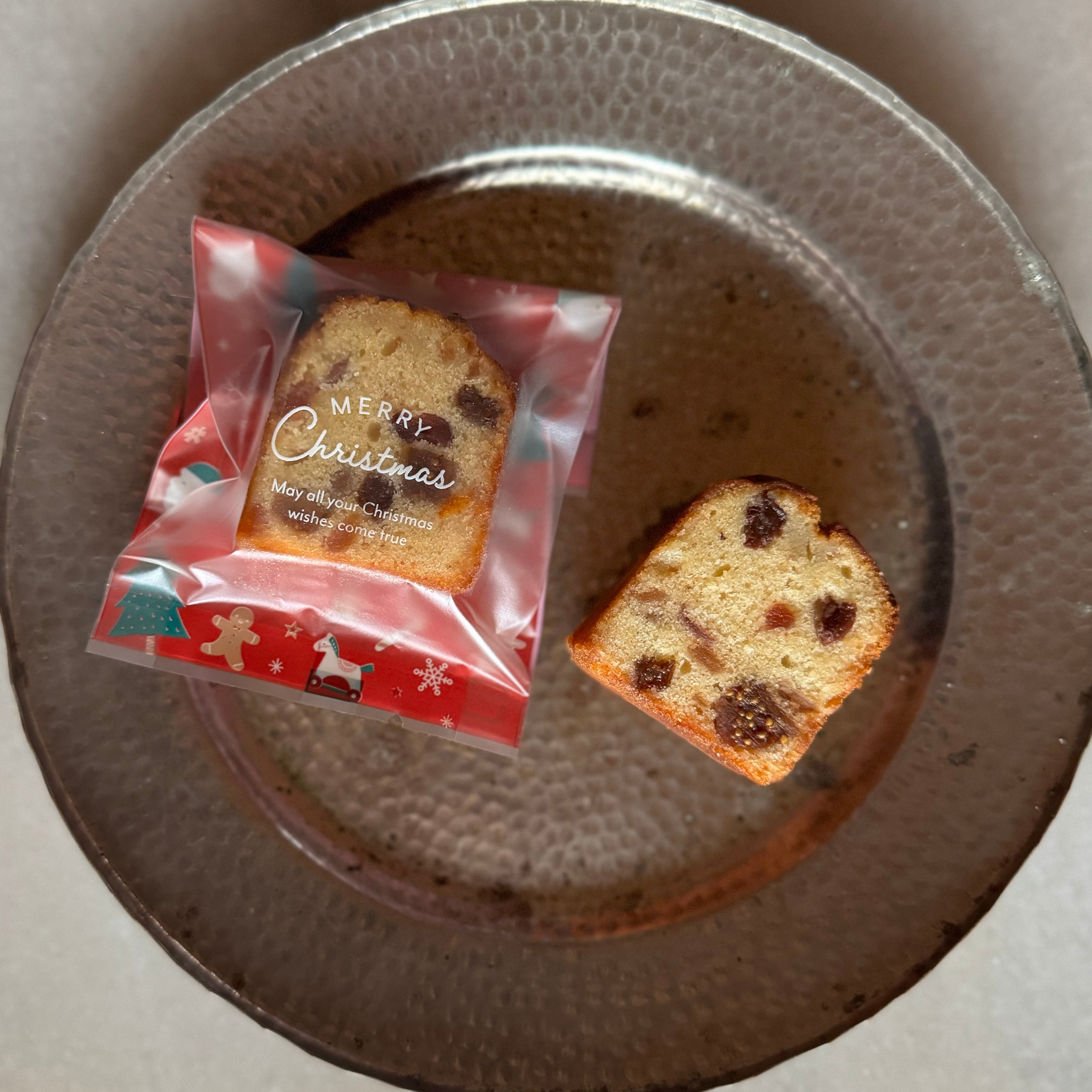 ブランデーにつけこんだ4種のドライフルーツ(レーズン、クランベリー、アプリコット、いちじく)を混ぜ込んだバターケーキ。