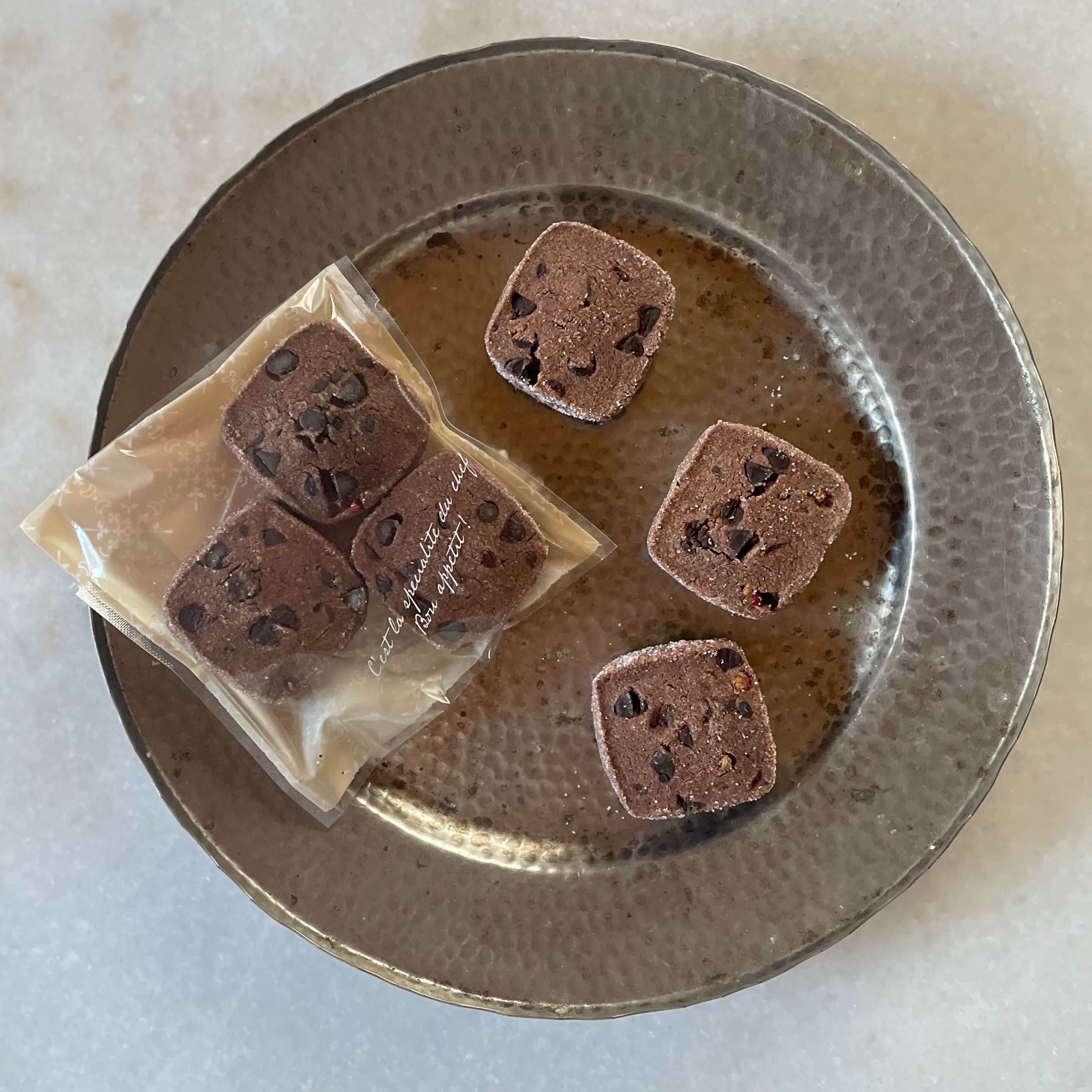 ピンクペッパーとたくさんのチョコチップが入ったココア味のサブレ。