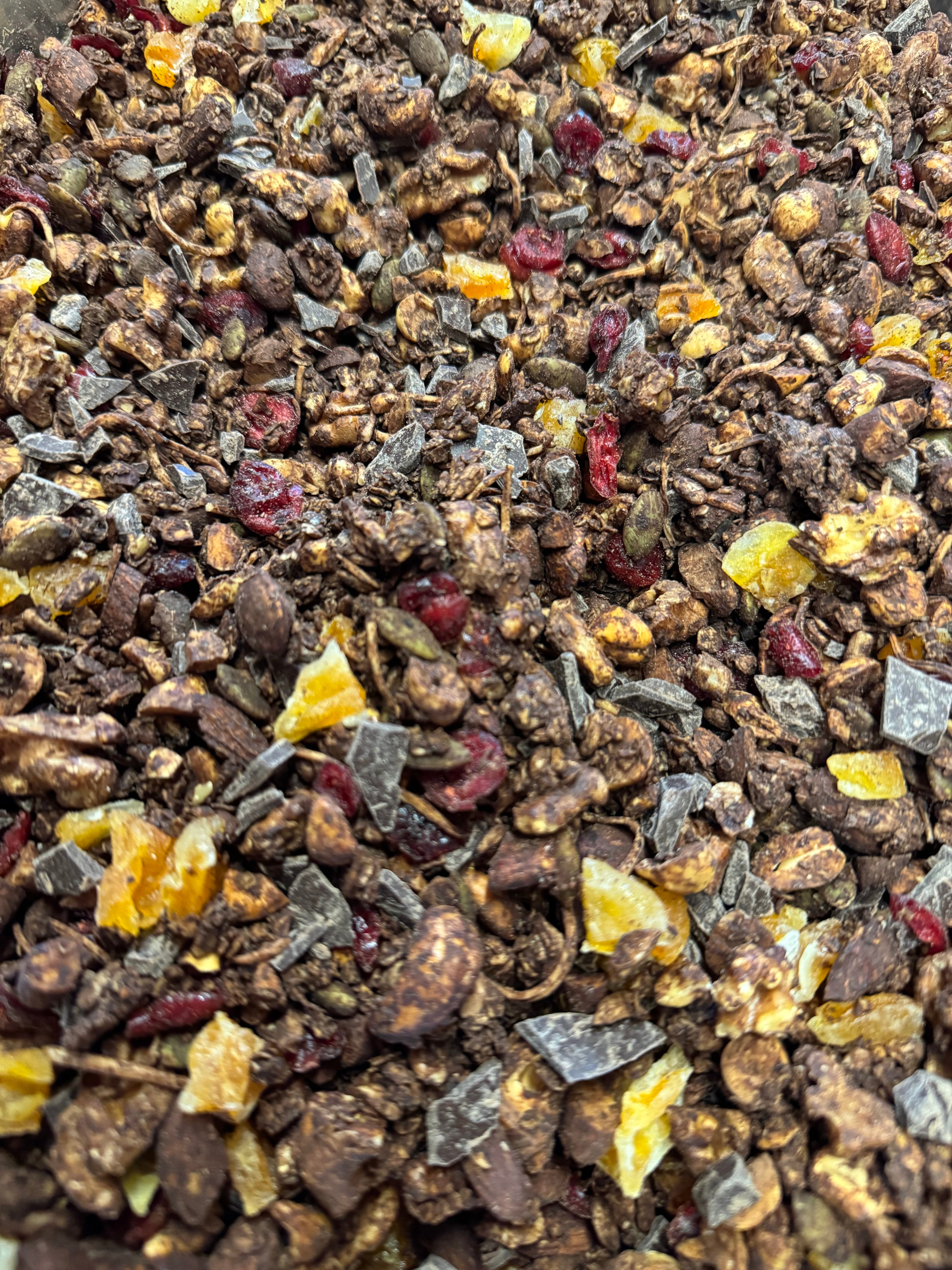 オートミールと7種のナッツやシード、ドライきよみオレンジとクランベリー、レーズン、パリパリビターチョコが入ったカカオ風味の香ばしいグラノーラです。